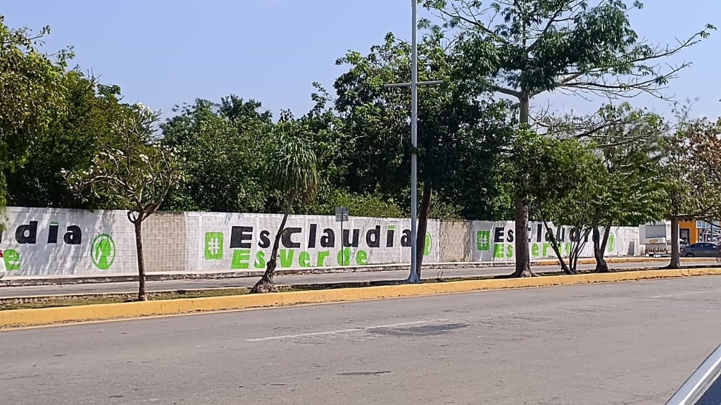 “Es Claudia, Es Verde” es el mensaje en esta pinta colocada en esta barda, en donde todavía puede verse levemente el mural que fue tapado con pintura blanca. Esta pinta es idéntica a una realizada en otra barda, esta sí particular, en la avenida 28 de Julio, y a muchas otras que fueron vistas en distintos puntos de Cancún.