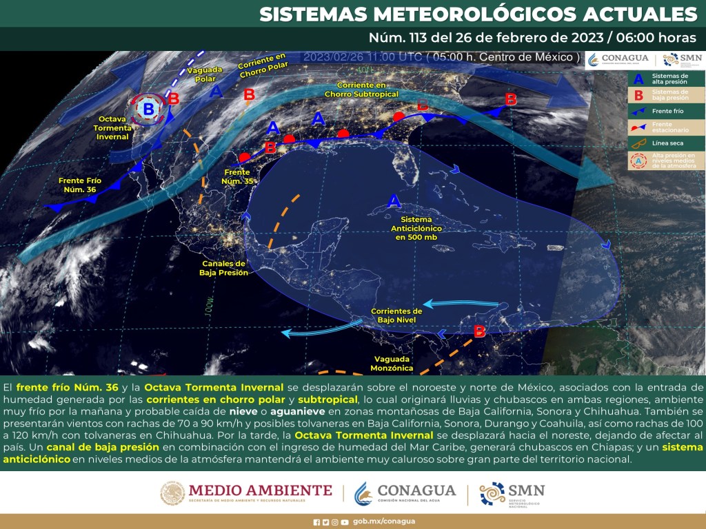 Este día, el frente frío Núm. 36 y la Octava Tormenta Invernal se desplazarán sobre el noroeste y norte de México, asociados con la entrada de humedad generada por las corrientes en chorro polar y subtropical, lo cual originará lluvias y chubascos en ambas regiones,