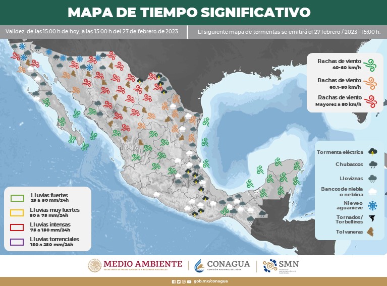 Lo anterior fue dado a conocer por el Servicio Meteorológico Nacional (SMN) en su pronóstico del tiempo para hoy y agrega que Campeche y Yucatán no tendrán lluvias; ambiente matutino templado y caluroso por la tarde; viento de componente este de 10 a 20 km/h con rachas de 40 a 60 km/h en la región.