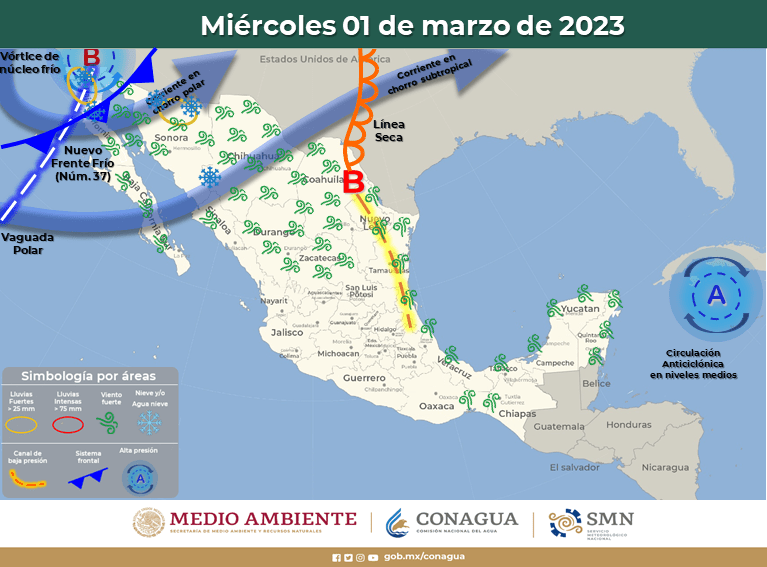 Un nuevo frente frío (Núm. 37) ingresará al noroeste de México, se asociará con un vórtice de núcleo frío que se localizará en el suroeste de Estados Unidos, una vaguada polar, y con las corrientes en chorro polar y subtropical, originando rachas de viento muy fuertes a intensas con tolvaneras en el noroeste y norte del territorio nacional.