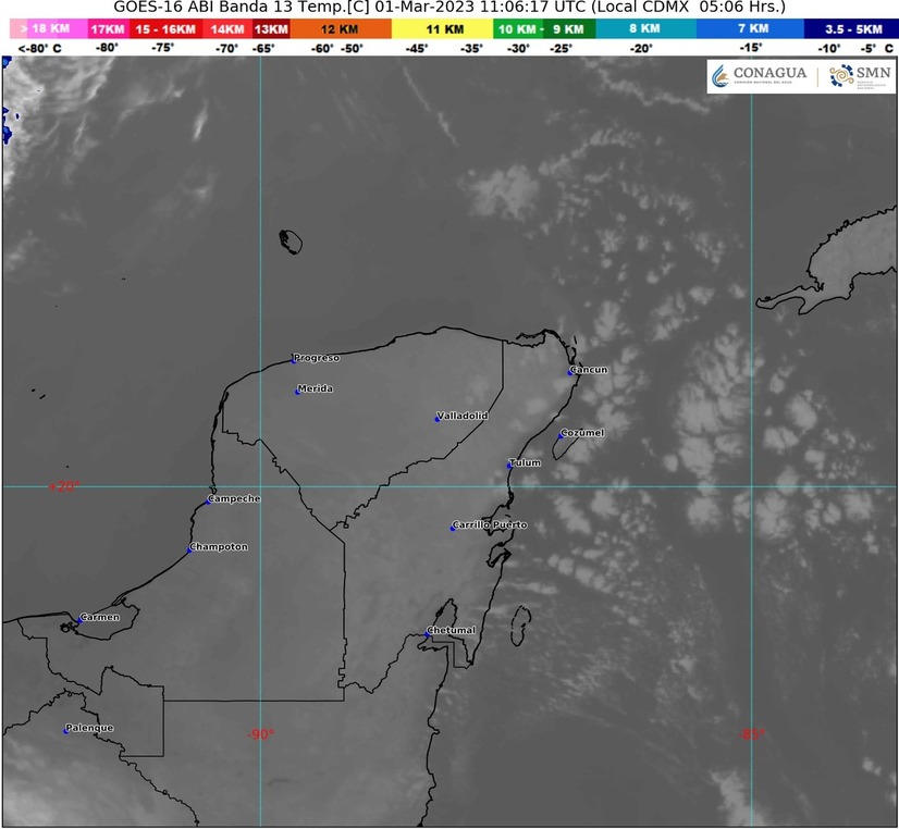 El pronóstico para la Península de Yucatán será de cielo parcialmente nublado por la mañana y medio nublado por la tarde con probabilidad de lluvias aisladas en Quintana Roo; sin lluvia en Campeche y Yucatán. Ambiente matutino templado y muy caluroso por la tarde. Viento de componente sur (Surada) con rachas de 50 a 70 km/h en la región.