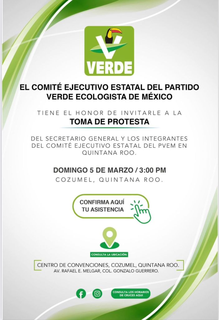Cabe destacar que es casi un hecho que en ese marco, Renán Sánchez Tajonar, diputado presidente de la Junta de Gobierno y Coordinación Política (Jugocopo) de XVII Legislatura del Congreso local, rinda protesta como nuevo presidente del PVEM en Quintana Roo.