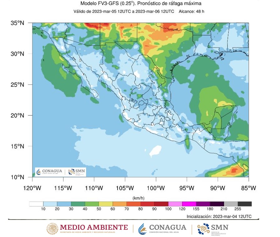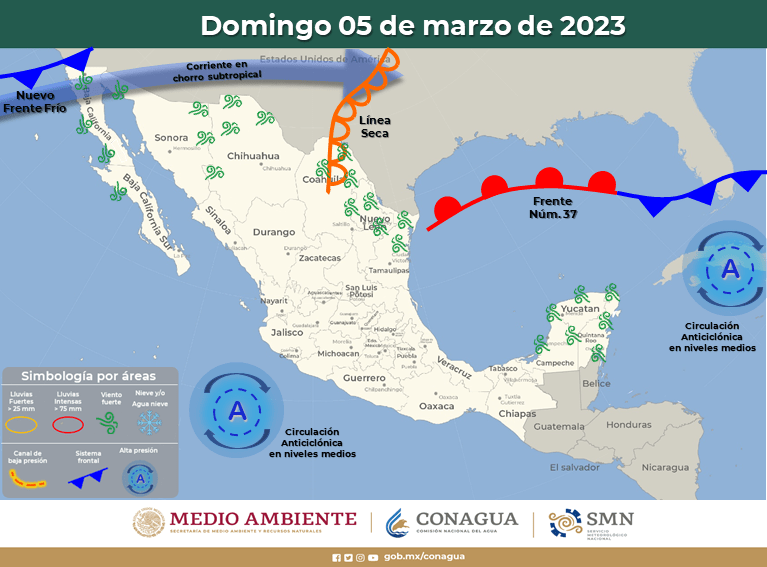 Por otra parte, un nuevo frente frío se aproximará al norte de Baja California, interaccionará con la corriente en chorro subtropical, provocando rachas fuertes de viento en el noroeste de México.