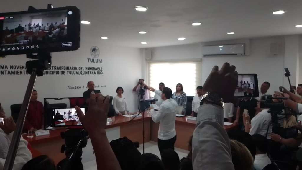 “Protesto cumplir y hacer cumplir la constitución política de los estados unidos mexicanos, del estado libre y soberano de Quintana Roo, las leyes que de ellas emanen y los acuerdos y disposiciones dictados por el Ayuntamiento, y desempeñar leal y patrióticamente el cargo de presidente municipal, mirando en todo por el bien por la prosperidad de la nación, del estado de Quintana Roo y nuestro municipio de Tulum. Si así no lo hiciere, que el pueblo me lo demande”, afirmó el nuevo presidente municipal, quien recibió aplausos.