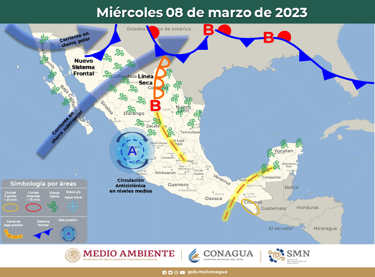 Por la tarde, la línea seca sobre el noreste, la entrada de humedad del Golfo de México y la aproximación de un nuevo frente frío, originarán lluvias aisladas que podrían acompañarse de descargas eléctricas en Coahuila, así como vientos de 50 a 70 km/h y posibles tolvaneras en Chihuahua, Coahuila, Nuevo León y Tamaulipas.