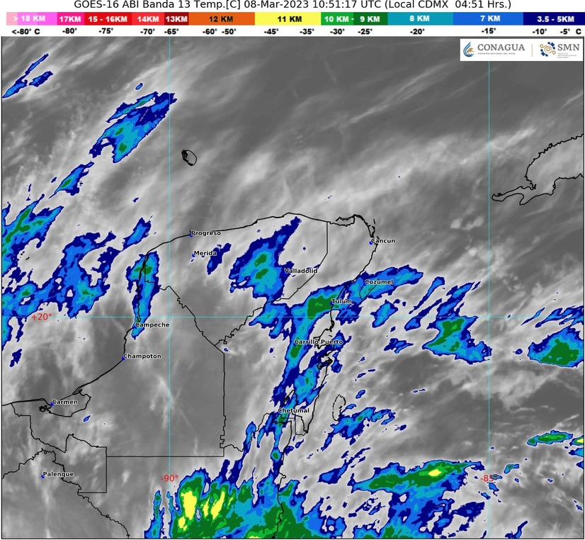 Para la Península de Yucatán habrá cielo parcialmente nublado en la mañana y nublado por la tarde; ambiente matutino templado y muy caluroso en la tarde; viento del este con rachas de 40 a 50 km/h en Campeche y Yucatán.