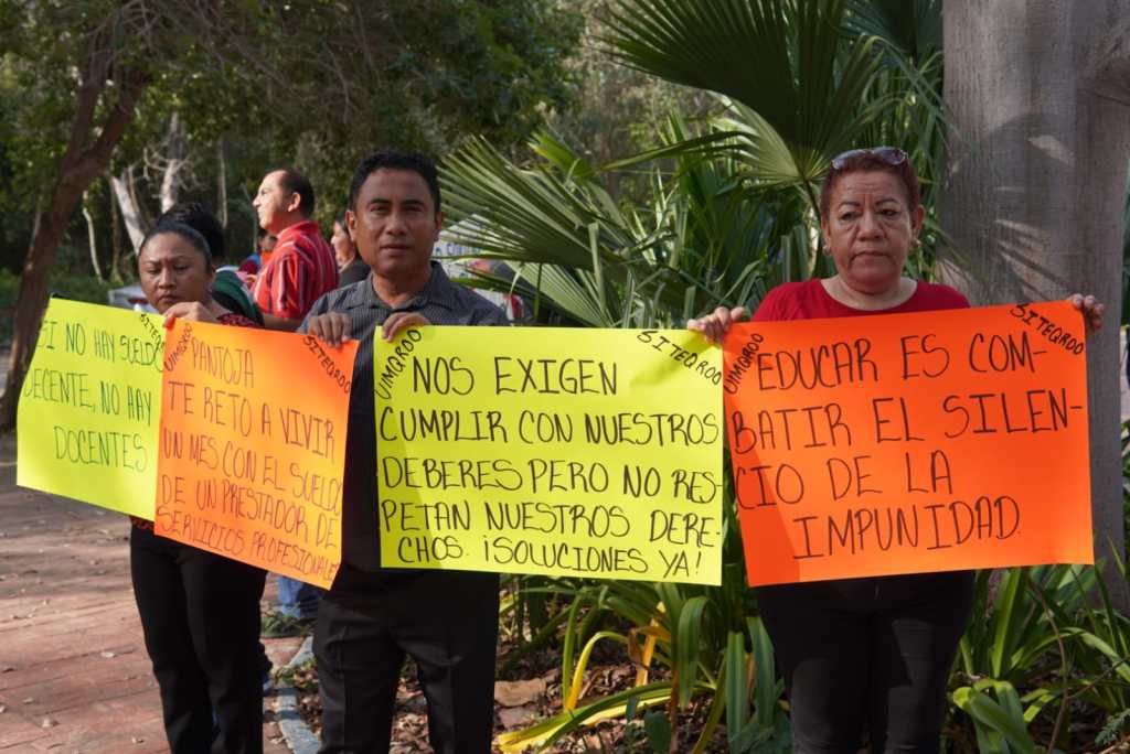 Un grupo de docentes de la Universidad Intercultural Maya de Quintana Roo (Uimqroo), afiliados al Sindicato Independiente de Trabajadores de la Educación de Quintana Roo (Siteqroo) se manifestaron de manera pacífica afuera de esta casa de estudios, y luego en el Palacio Municipal, en exigencia de un alza salarial, que no han tenido desde 2015.
