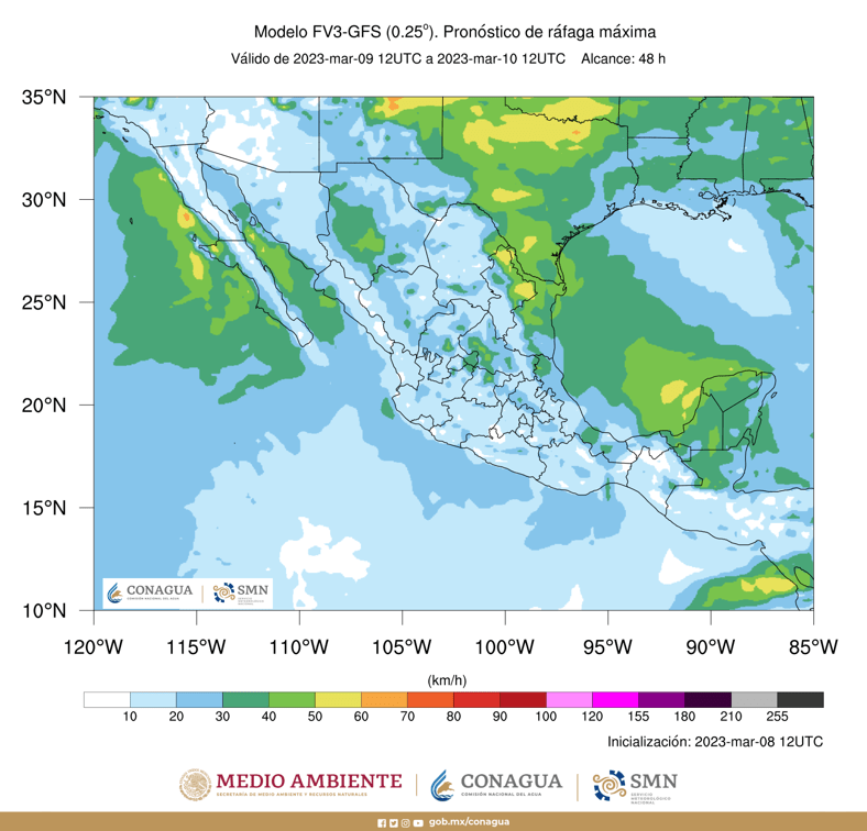 Finalmente, un sistema anticiclónico en niveles medios de la atmósfera mantendrá por la tarde, ambiente caluroso a muy caluroso sobre la mayor parte del territorio nacional, con temperaturas máximas superiores a 40 °C en zonas de Michoacán, Guerrero y Morelos.