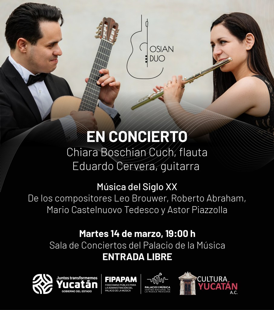 La agrupación que integran la flautista italiana Chiara Boschian Cuch y el guitarrista mexicano Eduardo Cervera Osorio, regresa al Centro Nacional de la Música Mexicana, este martes 14 a las 19:00 horas, con entrada libre, como parte de la iniciativa que impulsa el Gobernador Mauricio Vila Dosal para abonar a la oferta cultural de Yucatán.