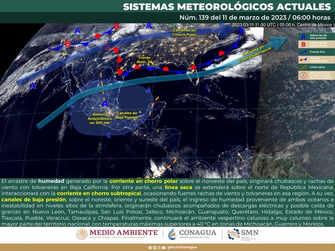 Por otro lado, el arrastre de humedad generado por la corriente en chorro polar sobre el noroeste del país originará chubascos y rachas de viento con tolvaneras en Baja California. Una línea seca se extenderá sobre el norte de República Mexicana, interaccionará con la corriente en chorro subtropical, ocasionando fuertes rachas de viento y tolvaneras en esa región.
