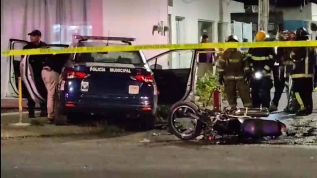 De acuerdo con testigos, la patrulla, con número 7141, no efectuó su alto obligatorio al llegar al cruce de las mencionadas vialidades, lo que generó que impactara a un motociclista, quien terminó tirado cinco metros más adelante.