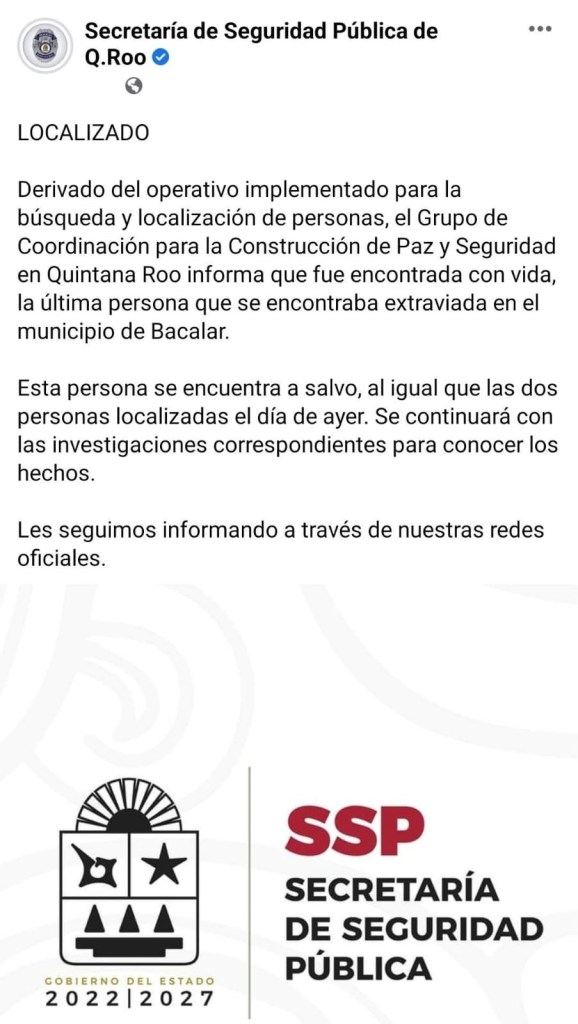 “Esta persona se encuentra a salvo, al igual que las dos personas localizadas el día de ayer. Se continuará con las investigaciones correspondientes para conocer los hechos”, detalla la dependencia en un comunicado.