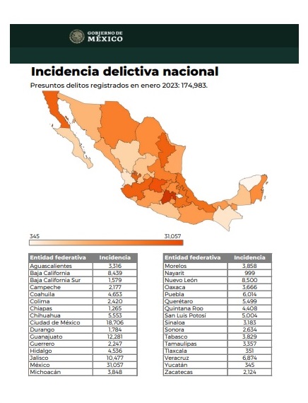 Con estas cifras, Quintana Roo lleva por mucho la delantera en incidencia delictiva, donde específicamente en enero fueron 131 homicidios; 424 lesiones; 22 delitos que atentan contra la vida y la integridad corporal; 98 delitos que atentan contra la libertad personal; 246 delitos contra la libertad y la seguridad sexual; 113 robos a casa habitación; 388 robos de vehículos; 190 robos a personas; 147 robos a negocios; 575 robos diversos; 278 a busos de confianza; 447 daño a la propiedad; 549 violencia familiar; 144 narcomenudeo; 259 amenazas; 31 delitos cometidos por servidores públicos y 159 de otros delitos del fuero común.