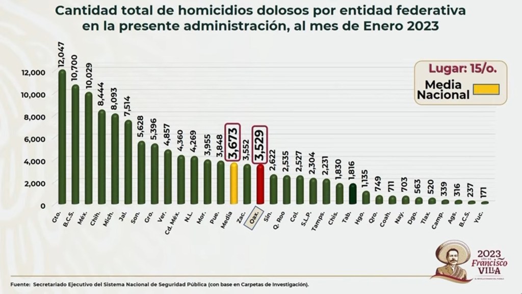 Durante su conferencia mañanera de hoy, realizada en esta ciudad en el marco del natalicio de Benito Juárez, López Obrador pidió a su equipo de comunicación que colocara la gráfica de la incidencia de homicidios en el país, para señalar que Oaxaca está por debajo de la media nacional «cómo todos los estados del Sureste».