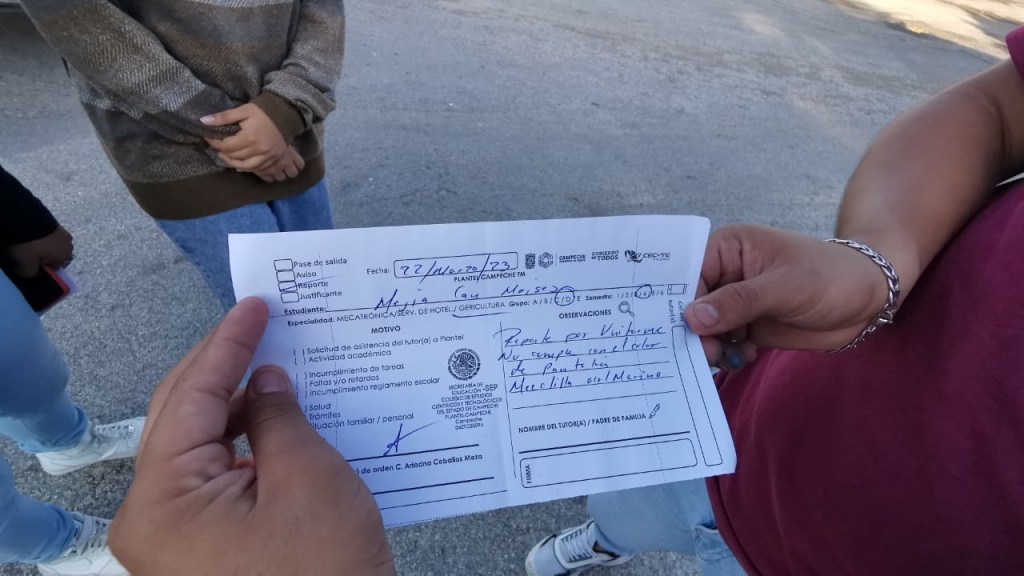El director del plantel Campeche, Gabriel Altamirano, confirmó que tomaron la decisión de retirar a quienes no cumplan con el reglamento, en este caso por no usar el color del pantalón acordado en la junta general con los paterfamilias y tutores desde que comenzó el ciclo escolar 2022-2023, que consiste en camisa y/o playera con cromática, escudos y distintivos oficiales, y pantalones de tela de mezclilla color azul marino que no esté roto o deshilado.