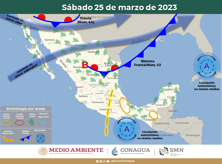 Por otro lado, el sistema frontal Núm. 43 se extenderá con características de estacionario sobre el norte y noreste de la República Mexicana, originará vientos fuertes con posibles tolvaneras en dichas regiones, así como lluvias aisladas con descargas eléctricas en Nuevo León, Tamaulipas y San Luis Potosí.