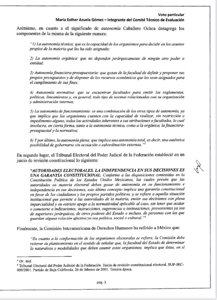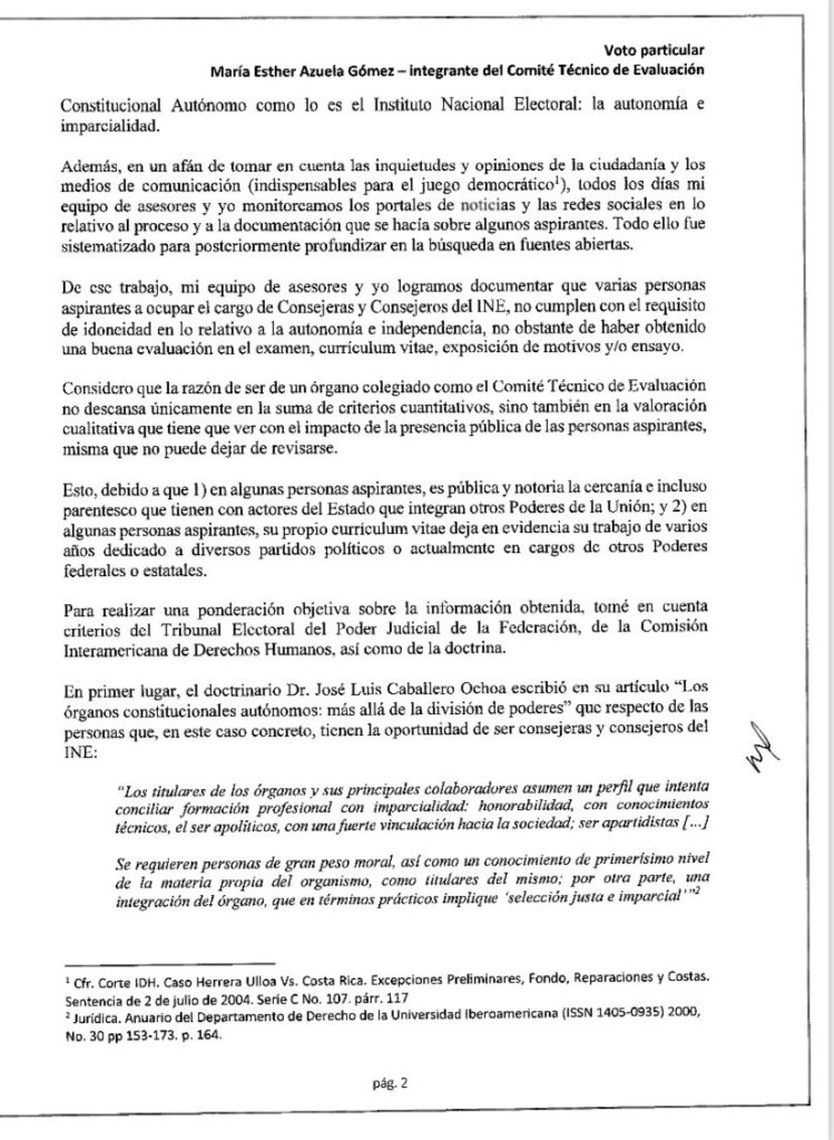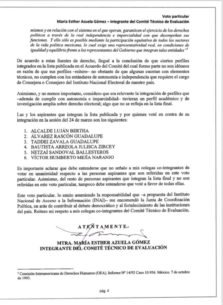 En la Sesión de ayer, el Comité Técnico de Evaluación, responsable de la selección de los aspirantes a Consejeros, hubo una sorpresa inesperada, ya que la integrante María Esther Azuela Gómez, pidió hacer el uso de la voz para hacer publico su «voto particular» con el cuál prácticamente descalifica a seis de los finalistas; la letrada dijo: «… Llegué a la conclusión de que ciertos perfiles integrados en la lista publicada en el acuerdo del Comité del cual formo parte no son idóneos en razón de que sus perfiles -reitero- no obstante de que algunas cuentan con elementos técnicos, no cumplen con estándares de autonomía e independencia que requiere el cargo de Consejera o Consejero del Instituto Nacional Electoral de nuestro país».