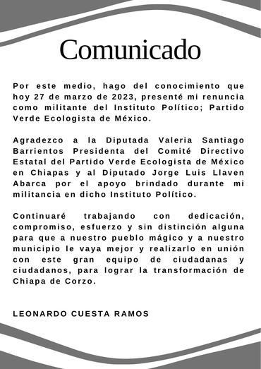 Dos presidentes municipales postulados por el Partido Verde Ecologista de México (PVEM), Leonardo Cuesta Ramos de Chiapa de Corzo y Mariano Alberto Díaz Ochoa de San Cristóbal de las Casas, han renunciado a esa fuerza política y manifestaron su intención de unirse al Movimiento de Regeneración Nacional (Morena). Sin embargo, no tienen garantizado ningún puesto de candidatura en las elecciones del 2024.