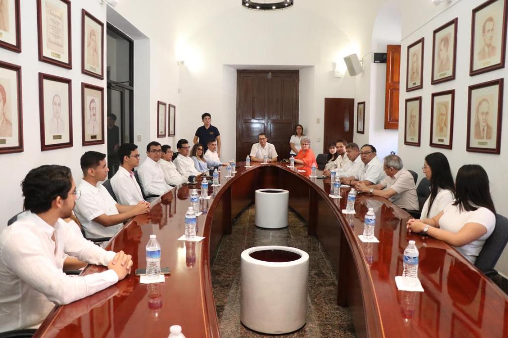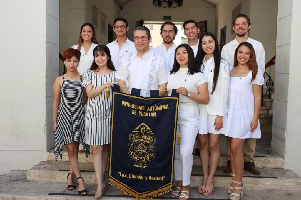 Durante la reunión realizada en el Salón de Rectores del Centro Cultural Universitario, el rector felicitó a los nueve alumnos de las licenciaturas en Derecho, Ingeniería, Ingeniería Química, Educación, Medicina, Economía, Psicología, que conforman el equipo que representará a la Universidad Autónoma de Yucatán (UADY) en el Cuartel General de la ONU en Nueva York.