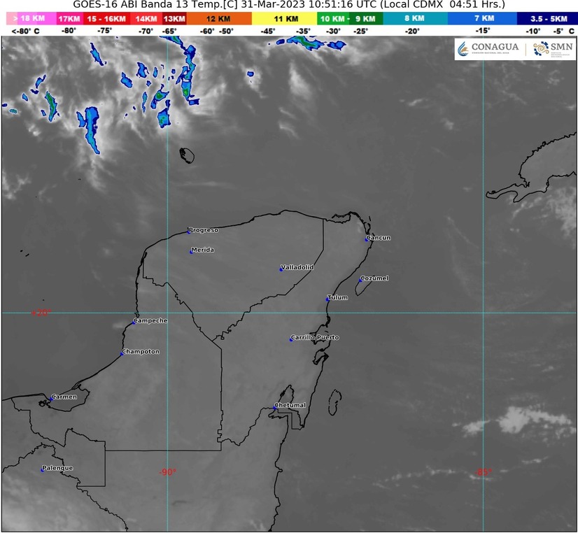 Para la Península de Yucatán habrá cielo medio nublado por la tarde con probabilidad de lluvias aisladas en Quintana Roo; sin lluvia en el resto de la región; ambiente templado por la mañana y caluroso a muy caluroso por la tarde; viento de componente este de 15 a 30 km/h con rachas de 40 a 60 km/h y posibles tolvaneras en Campeche, Yucatán y Quintana Roo.