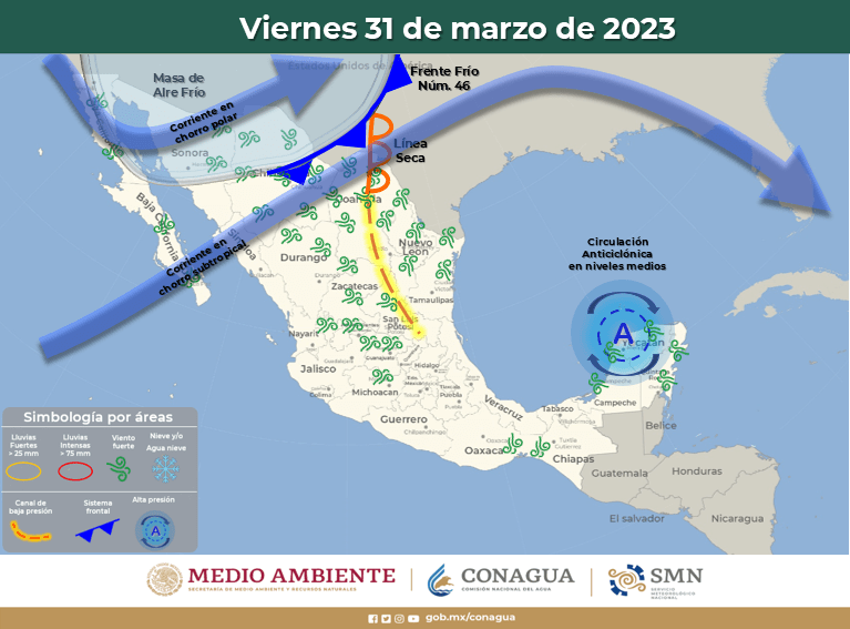 El frente frío Núm. 46 se extenderá sobre el norte del país, interaccionará con una línea seca que se localizará en el noreste de México y con la corriente en chorro subtropical, ocasionando fuertes rachas de viento, lluvias y chubascos en el noreste del territorio nacional.