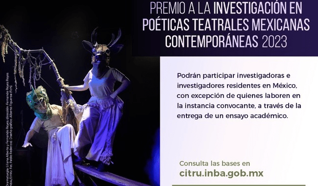Para visibilizar las prácticas teatrales de México, propiciar su estudio e incentivar el trabajo de investigación sobre procesos de creación teatral, la Secretaría de Cultura del Gobierno de México, a través del Instituto Nacional de Bellas Artes y Literatura (Inbal), la Subdirección General de Educación e Investigación Artísticas (Sgeia) y el Centro de Investigación, Documentación e Información Teatral “Rodolfo Usigli” (Citru), lanza la Convocatoria a la Investigación en Poéticas Teatrales Mexicanas Contemporáneas 2023.