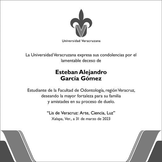 A través de las redes sociales, la institución educativa envió el pésame a los familiares y amistades de Esteban Alejandro García Gómez, estudiante de la Facultad de Odontología, región Veracruz.