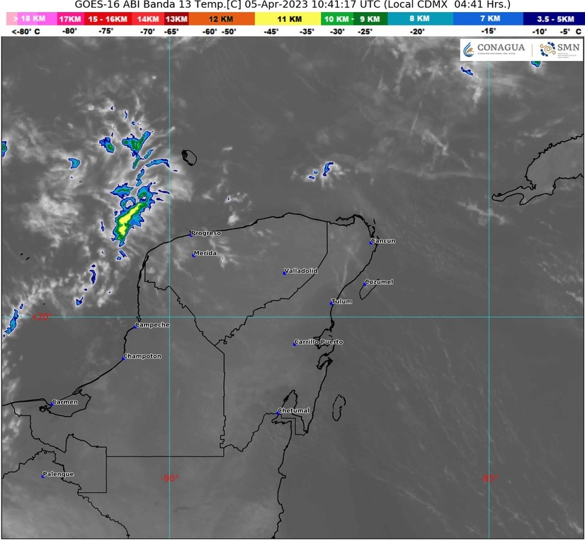 Hoy en la Península de Yucatán tendrán cielo parcialmente nublado y sin lluvia en la región; ambiente templado por la mañana, y cálido a caluroso por la tarde en zonas de Quintana Roo (35-40° C) y muy caluroso en Campeche y Yucatán (40-45° C); viento de componente este de 15 a 30 km/h en la región, con rachas de 50 a 60 km/h en Campeche, Yucatán y Quintana Roo.