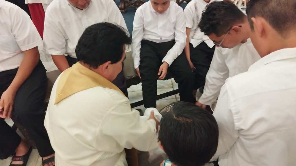 Con la representación del lavado de pies que Jesucristo realizó a sus 12 apóstoles, con lo cual inicia el Triduo Pascual en que se celebra la cena del señor, la pasión y muerte de Jesús este viernes y su resurrección el Sábado de Gloria, el sacerdote Francisco Velázquez Trejo conmemoró la primera eucaristía, la institución del sacerdocio y el mandamiento del amor.En la misa también se conmemoró al sacerdote para poderla celebrar, hacerla presente y actualizarla, pues Jesús busca no sólo rememorar la eucaristía, sino también a los curas, y por eso también se les felicita por haber decidido consagrar su vida hacia al Señor.Velázquez Trejo mencionó que todos caminaron desde la Cuaresma y con el Viernes Santo se ayuna, excepto menores y adultos mayores, y es un proceso consciente de cómo es la relación con Dios y con el prójimo, por lo cual hubo 24 horas de confesión.Dentro de la cena del Señor, se tiene el gesto significativo del lavatorio de pies, donde el Señor se hace siervo para dar ejemplo de servicio y entrega, y eso motiva a los fieles a participar en esta celebración recordando cómo Jesús fue tomado preso.