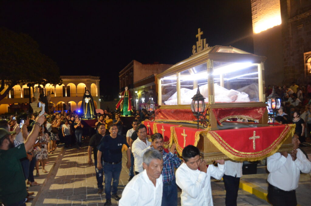 Para la representación del Santo Entierro de Jesucristo, la pesada imagen estaba delicadamente recostada dentro de una vitrina de vidrio, y fue cargada por más de 10 personas.
