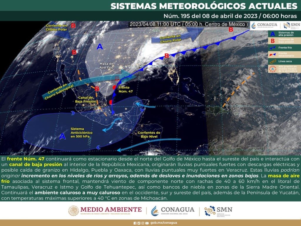 Para hoy, el frente Núm. 47 continuará como estacionario desde el norte del Golfo de México hasta el sureste del país e interactúa con un canal de baja presión al interior de la República Mexicana, originarán lluvias puntuales fuertes con descargas eléctricas y posible caída de granizo en Hidalgo, Puebla y Oaxaca, con lluvias puntuales muy fuertes en Veracruz.