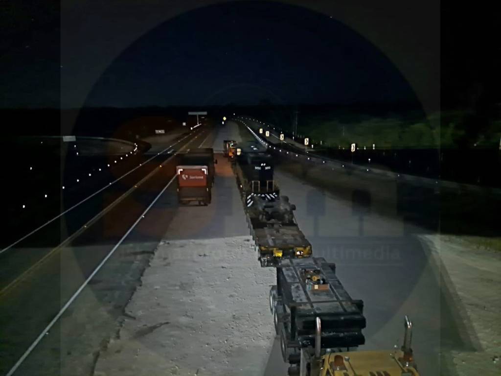Una plataforma que transporta una locomotora que forma parte del proyecto federal del Tren Maya pasó la noche de ayer sábado en la carretera de Felipe Carrillo Puerto, en la salida a Mérida.