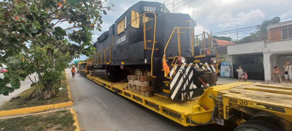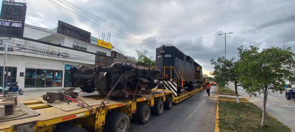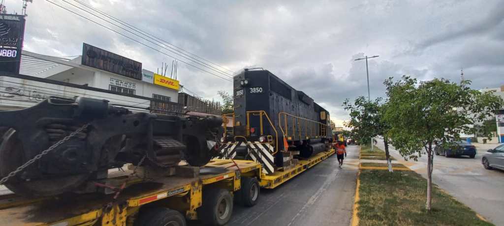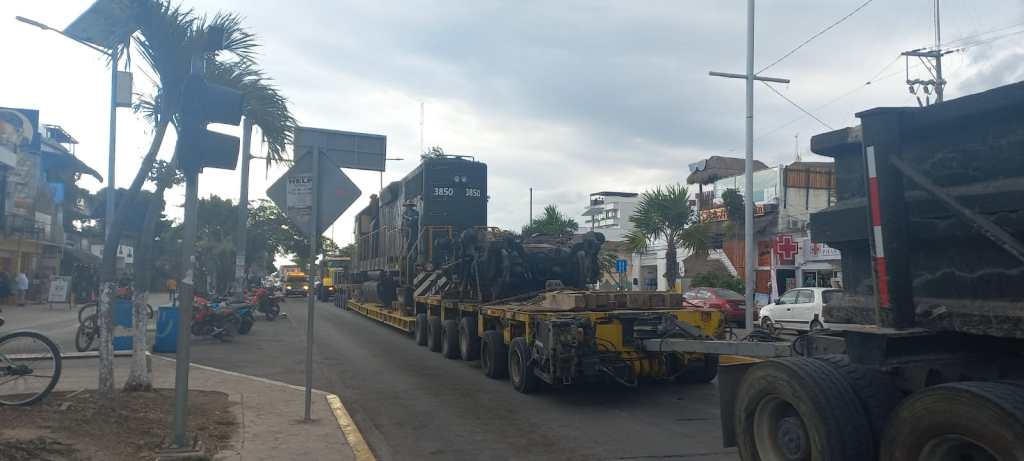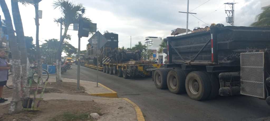Tulum.- La locomotora del Tren Maya que ayer fue vista en Felipe Carrillo Puerto hoy fue llevada en convoy por el centro de esta ciudad, rumbo al norte del estado.Este vehículo, con número 3850, es transportado por una grúa especial, acompañada de varios camiones pesados, al parecer en un convoy coordinado por la Secretaría de Defensa Nacional (Sedena).Esta locomotora ayer fue vista cruzando la ciudad de Calakmul, en Campeche, con rumbo a Quintana Roo.