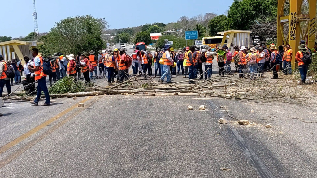 ESCÁRCEGA.— Molestos por los malos tratos, incumplimiento en los contratos laborales, bajos salarios y corrupción de militares a cargo del tramo 7 —de Constitución a Lechugal— del Tren Maya, trabajadores cerraron ayer durante cinco horas la carretera federal a Xpujil, a la altura de la Junta Municipal de Centenario.