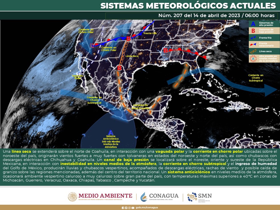Un sistema anticiclónico en niveles medios de la atmósfera, ocasionará ambiente vespertino caluroso a muy caluroso sobre gran parte del país, con temperaturas máximas superiores a 40 °C en zonas de Michoacán, Guerrero, Veracruz, Oaxaca, Chiapas, Tabasco, Campeche y Yucatán.