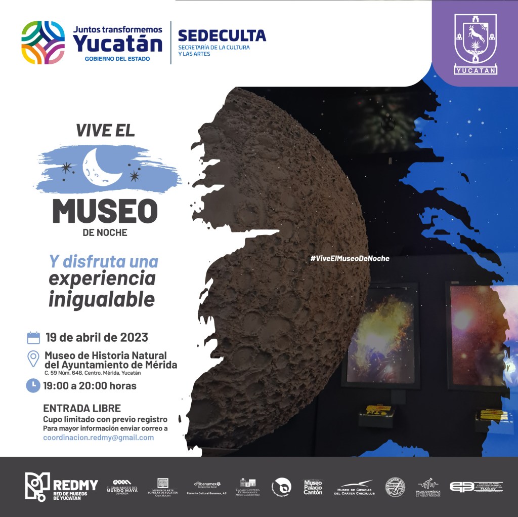 El esquema iniciará el 19 de abril en el Museo de Historia Natural del Ayuntamiento de Mérida, a las 19:00, con un recorrido de 60 minutos. La entrada será gratuita, con cupo limitado a 60 personas, quienes estén interesados deberán registrarse al correo electrónico coordinacion.redmy@gmail.com para reservar su lugar. Los menores de edad deberán ir acompañados por un adulto en todo momento.