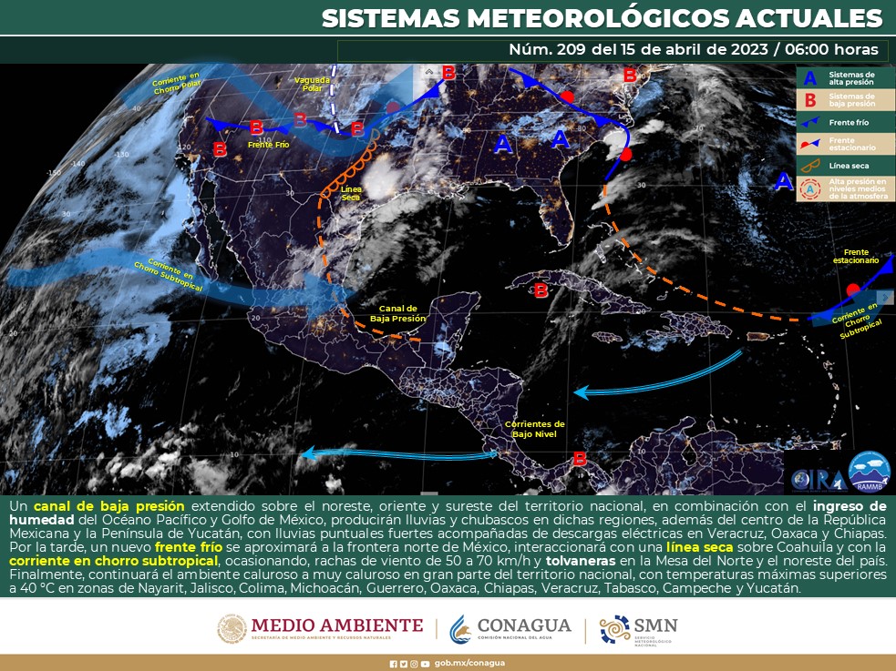 Finalmente, continuará el ambiente caluroso a muy caluroso en gran parte del territorio nacional, con temperaturas máximas superiores a 40 °C en zonas de Nayarit, Jalisco, Colima, Michoacán, Guerrero, Oaxaca, Chiapas, Veracruz, Tabasco, Campeche y Yucatán.