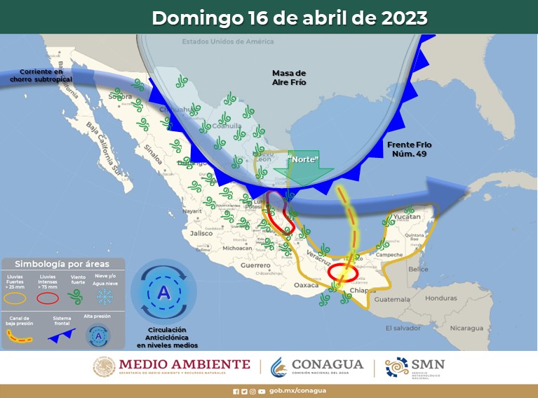 Por otro lado, el frente frío Núm. 49 y su masa de aire frío asociada se desplazarán sobre el Golfo de México, el noreste y oriente de la República Mexicana, en interacción con un canal de baja presión sobre el sur de dicho Golfo, originarán un refrescamiento de las temperaturas y vientos fuertes con tolvaneras en el norte, noreste, centro y oriente del país.