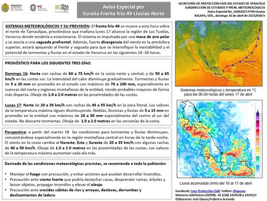 De acuerdo con la información, para este domingo 16 de abril, se espera un día con lluvias, tormentas y un nuevo evento de norte con rachas fuertes.