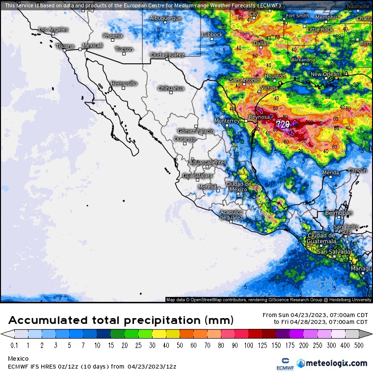 Finalmente, un sistema anticiclónico en niveles medios de la atmósfera continuará generando ambiente caluroso a muy caluroso en el litoral del Pacífico Mexicano, el sureste del país y la Península de Yucatán, con temperaturas máximas superiores a 40 °C en zonas de Jalisco, Colima, Michoacán, Guerrero, Oaxaca, Campeche y Yucatán.