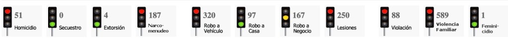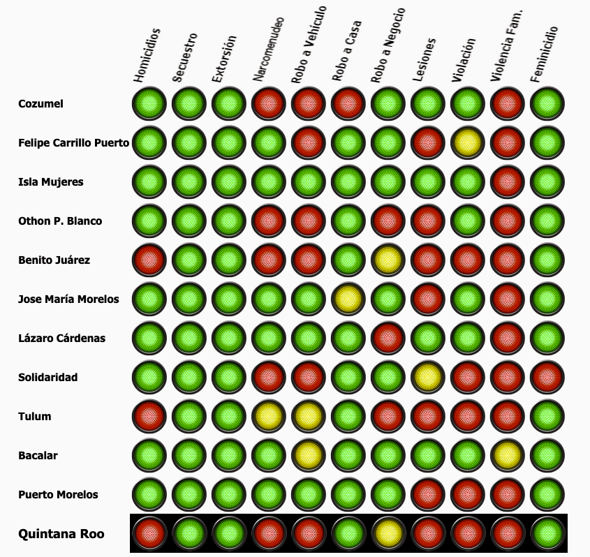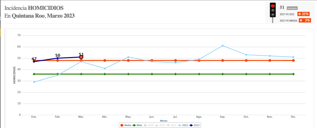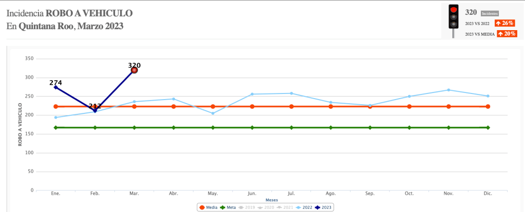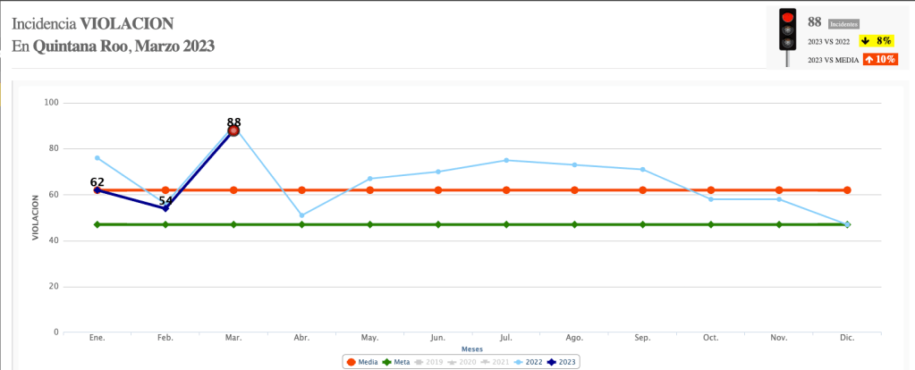Esto, de acuerdo al reporte del “Semáforo Delictivo” de Quintana Roo en su reporte de marzo, elaborado por la asociación “Semáforo”, en donde destaca que hubo 51 homicidios, 4 extorsiones, 187 narcomenudeo, 320 robos a vehículo, 97 robos a casa habitación, 167 robos a negocios, 250 lesiones, 88 violaciones, 589 actos de violencia familiar y 1 feminicidio.