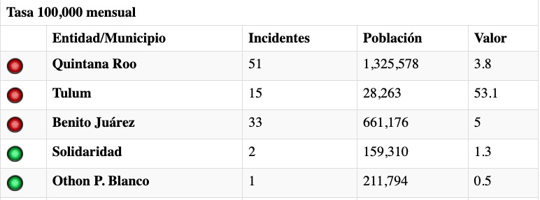 En cuanto a municipios, Tulum es lejos quien tiene la mayor tasa de incidencia en cuanto a homicidios, con 15 asesinatos en marzo, lo que equivale a una tasa de 53.1 por cada 100 mil habitantes. Le sigue Cancún, con una tasa de 5 por cada 100 mil habitantes, y después Solidaridad con 1.3.