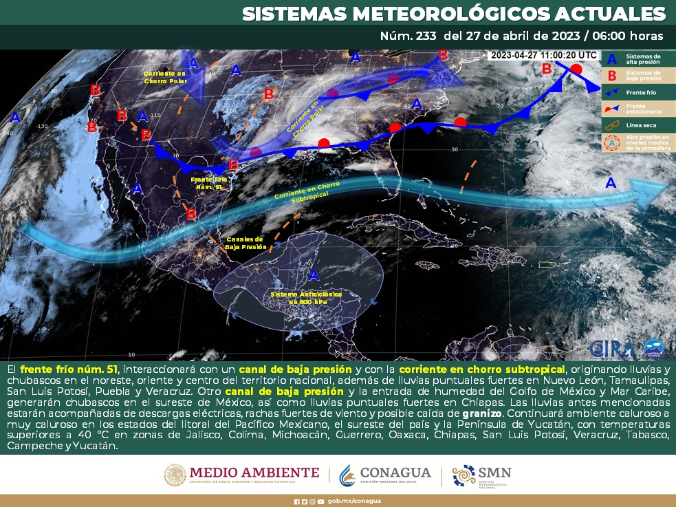Asimismo, esta dependencia abundó que el Frente Frío 51 se localiza, actualmente, al norte y noreste del país.