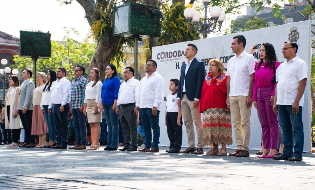 Encabezados por el Presidente Municipal, Juan Martínez Flores, ediles, directores de área del Ayuntamiento de Córdoba, y alumnado de la Telesecundaria Vicente Guerrero conmemoraron con un acto cívico el 405 Aniversario de la Fundación de Córdoba.