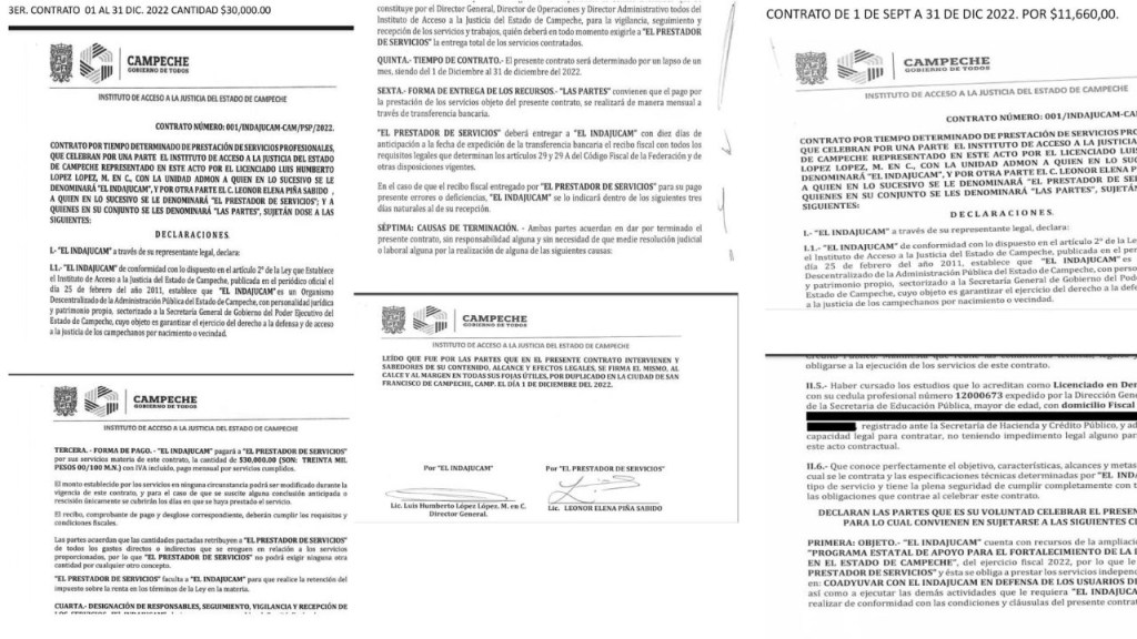 También adelantaron que la diputada Piña Sabido continúa percibiendo ingresos de 30 mil pesos al mes como parte del equipo de López López, aunque no lleva la defensa de ningún usuario, y que no se han subido los contratos correspondientes al portal de transparencia por ser de reciente firma.