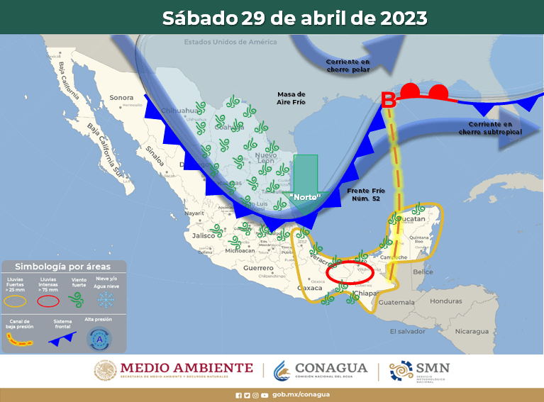 El frente frío Núm. 52 se desplazará sobre el oriente y sureste de la República Mexicana, originará lluvias muy fuertes a puntuales intensas acompañadas de descargas eléctricas, rachas de viento y posible caída de granizo en las regiones mencionadas.