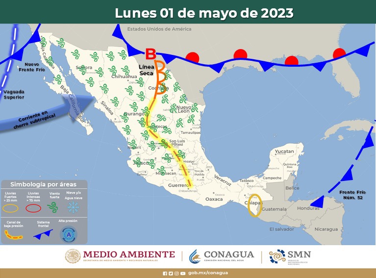 Un nuevo frente frío se aproximará al noroeste de México, se asociará con una vaguada en niveles medios y altos de la atmósfera, además de las corrientes en chorro subtropical y polar, ocasionarán viento con rachas de 70 a 90 km/h y tolvaneras en Baja California y Sonora, así como olas de 1.5 a 2.5 metros de altura en la costa occidental de Baja California.