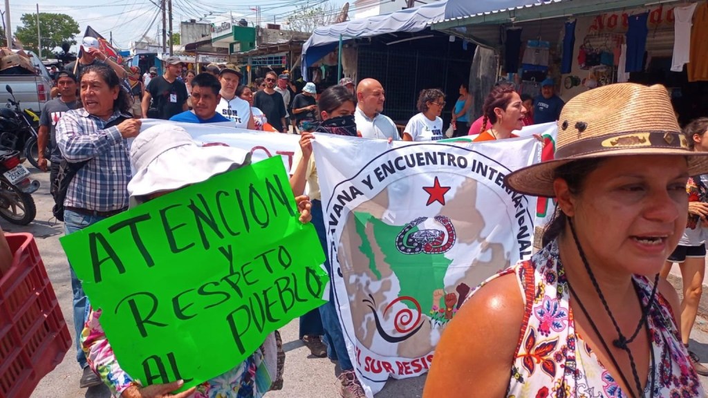 Marcharon desde la cancha deportiva Domo del Jaguar hasta el área donde es construida la estación del proyecto, donde Romel González Díaz, uno de los dirigentes del Consejo Regional Indígena Popular de Xpujil (CRIPX), entregó los oficios de amparo que ordenan suspender los trabajos, pero no son respetados.