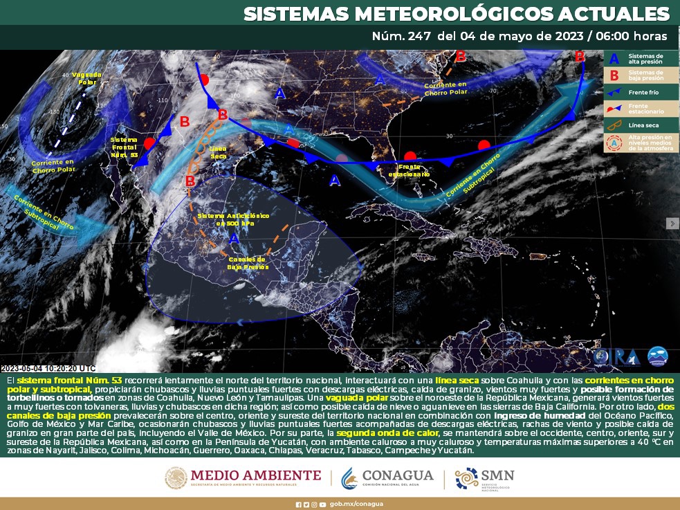 El sistema frontal Núm. 53 recorrerá lentamente el norte del territorio nacional, interactuará con una línea seca sobre Coahuila y con las corrientes en chorro polar y subtropical.