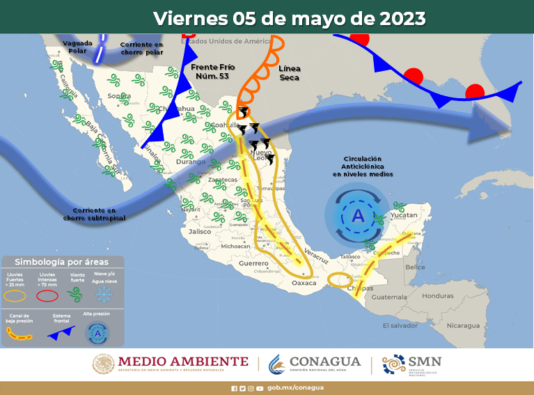 El frente Núm. 53 entrará en etapa de disipación y por la tarde dejará de afectar al país. A su vez, una línea seca sobre el noreste del territorio nacional mantendrá las condiciones para lluvias puntuales fuertes con tormentas eléctricas en Coahuila, Nuevo León, Tamaulipas y San Luis Potosí. Finalmente, persistirá la segunda onda de calor en gran parte de la República Mexicana, con temperaturas máximas superiores a 40 °C en zonas de Chiapas, Veracruz, Tabasco, Campeche y Yucatán. // Por: Agencia SIM